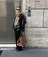 Den norske moteprofilen Rikke Krefting i et chic antrekk, bestående av et stort fuskepelsskjerf, stylet med en skinnbomber, vide dressbukser og ballerinasko.