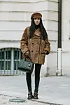 Et lekent antrekk bestående av en kort, oversized leopardjakke stylet med svarte bukser, pologenser, grønn veske og cordfløyels-hatt.