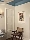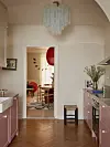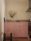 – Den var gammelrosa med lyseblå tekst, og jeg synes det er en så utrolig fin kombinasjon. Sammen med mørkerødt er de nå mine favorittfarger. Dette blir tydelig når man besøker den sjarmerende leiligheten, spesielt når man trer inn i det rosa kjøkkenet og ser ut på det blåmalte taket i stua.